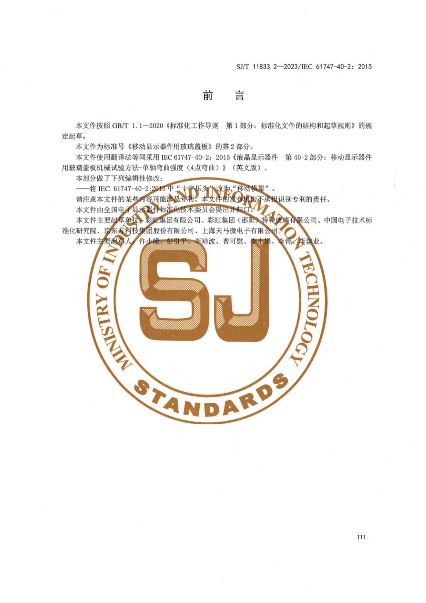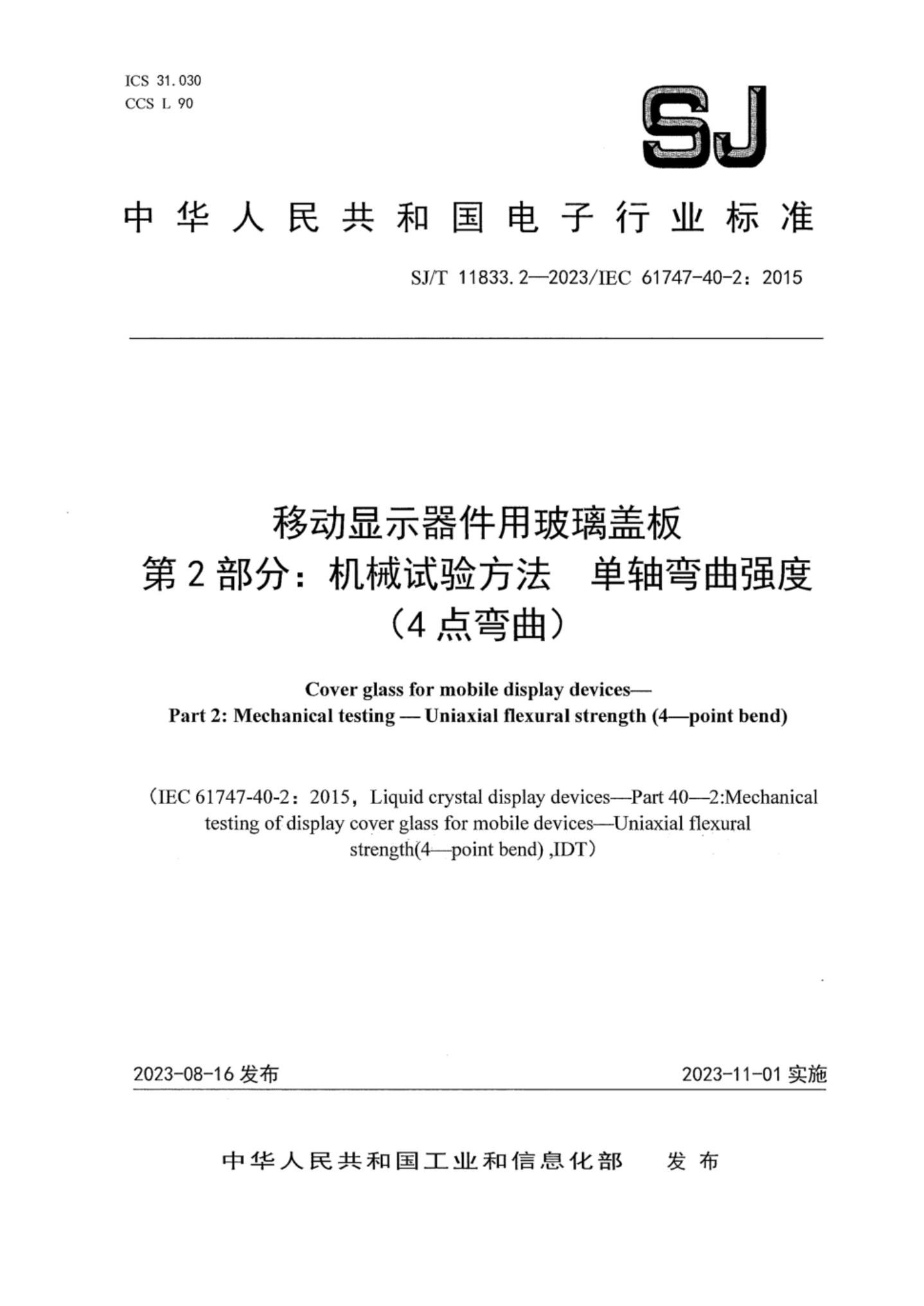 SJ/T 11833.2-2023/IEC 61747-40-2:2015 移动显示器件用玻璃盖板 第2部分:机械试验方法 单轴弯曲强度 (4点弯曲)