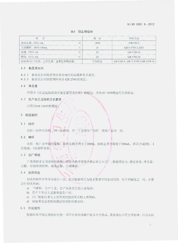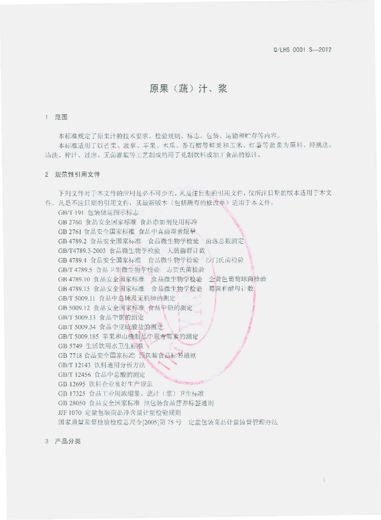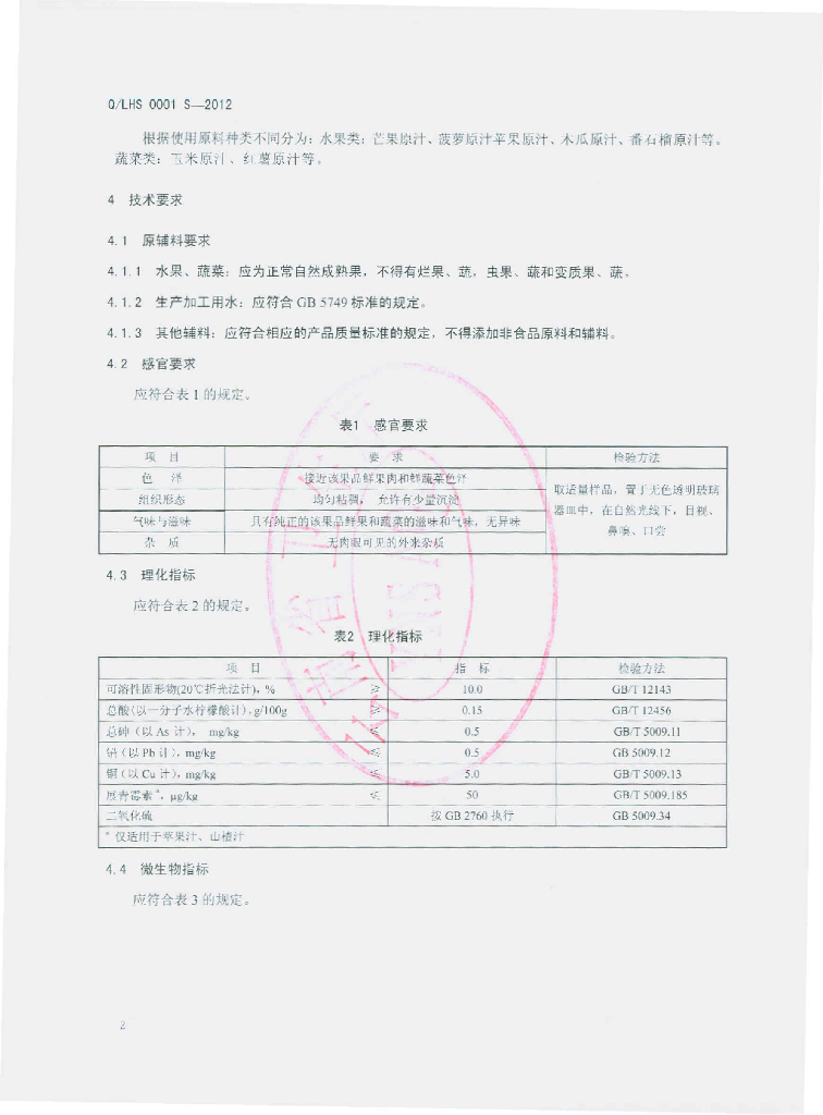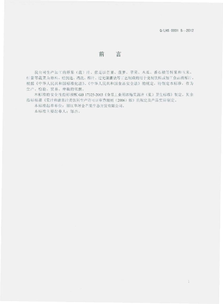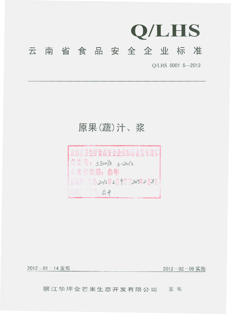 Q/LHS 0001S-2012 原果(蔬)汁、浆