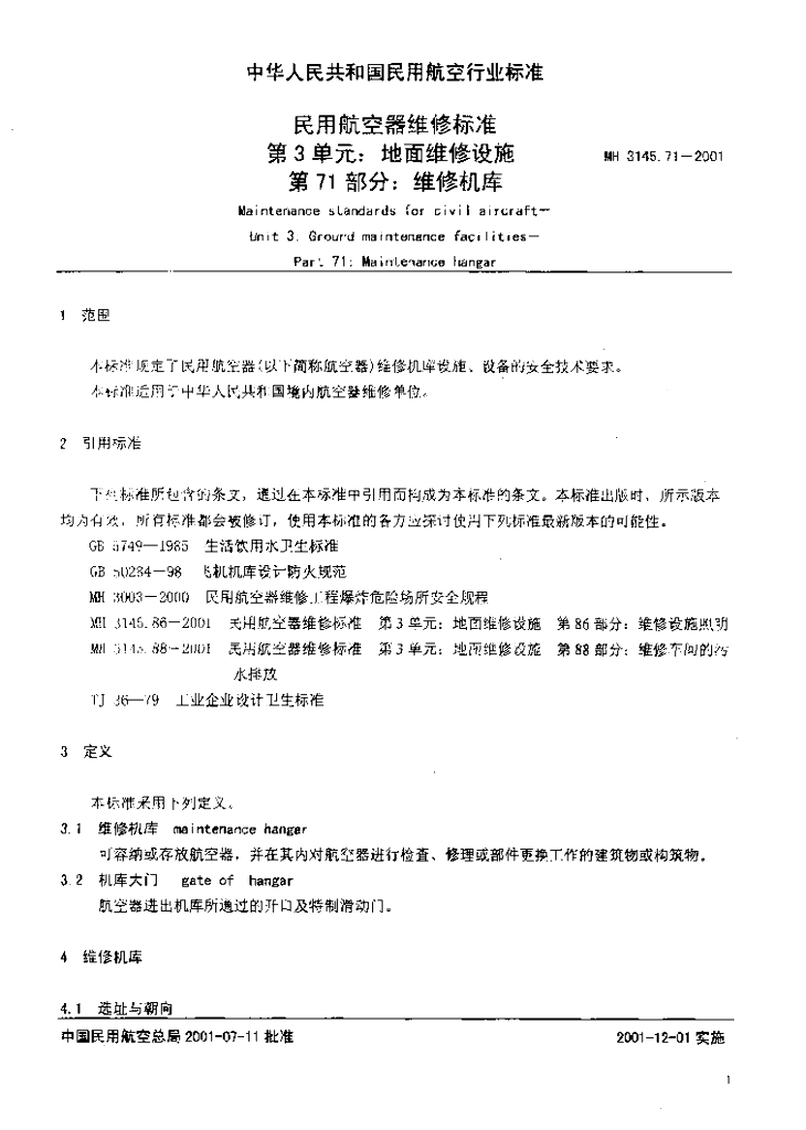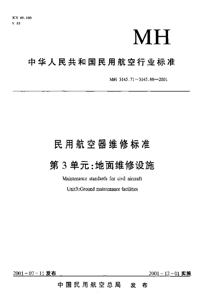 MH 3145.71-2001 民用航空器维修标准 第3单元 地面维修设施 第71部分 维修机库