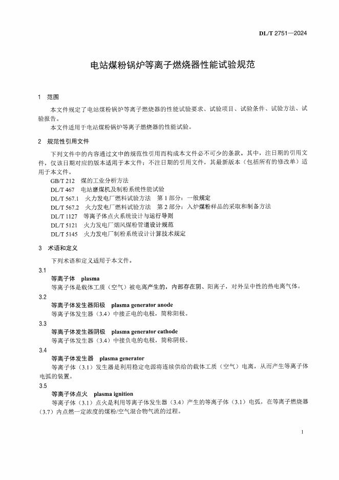 DL/T 2751-2024 电站煤粉锅炉等离子燃烧器性能试验规范