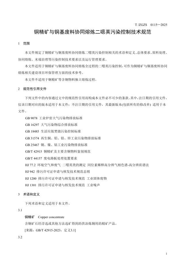 T/ZGZS 0115-2025 铜精矿与铜基废料协同熔炼二噁英污染控制技术规范