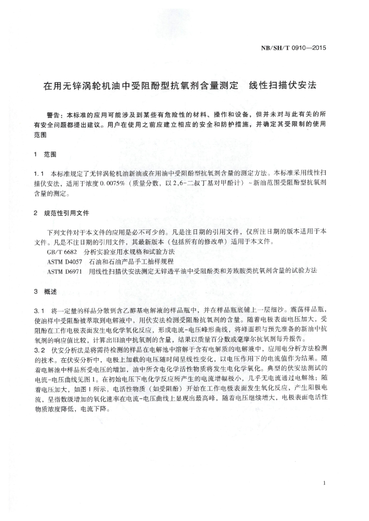 NB/SH/T 0910-2015 无锌涡轮机油中受阻酚型抗氧剂含量测定法 线性扫描伏安法