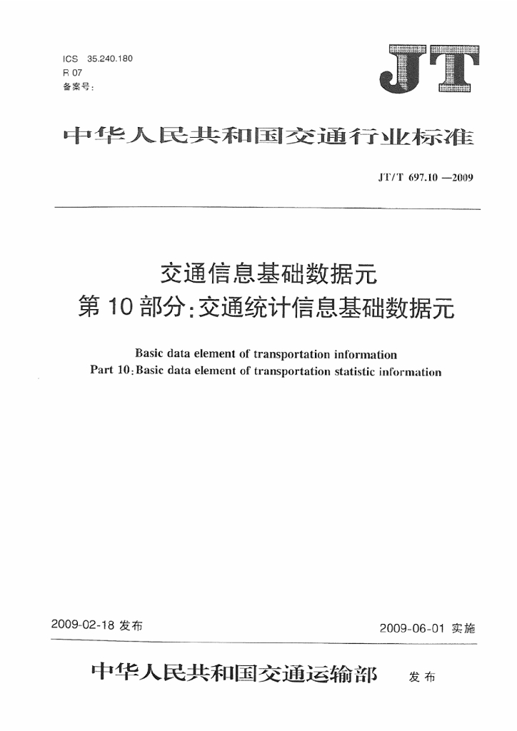JT/T 697.10-2009 交通信息基础数据元 第10部分:交通统计信息基础数据元