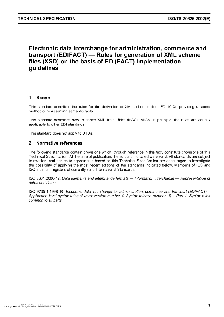 ISO/TS 20625-2002 管理、贸易和传输用电子数据交换(EDIFACT) EDI(FACT)补充导则基础的XML方案文件(XSD)的产生规则