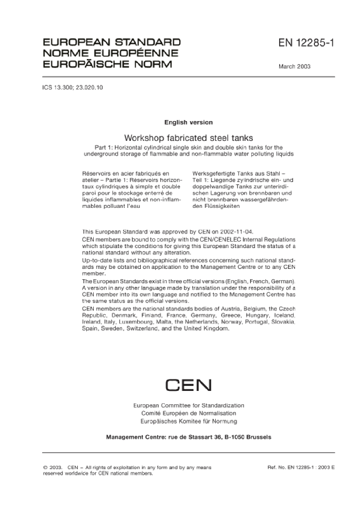 DIN EN 12285-1-2003 焊接钢罐 第1部分:地下储存可燃和不可燃对水有污染液体的卧式圆柱单壁和双壁罐
