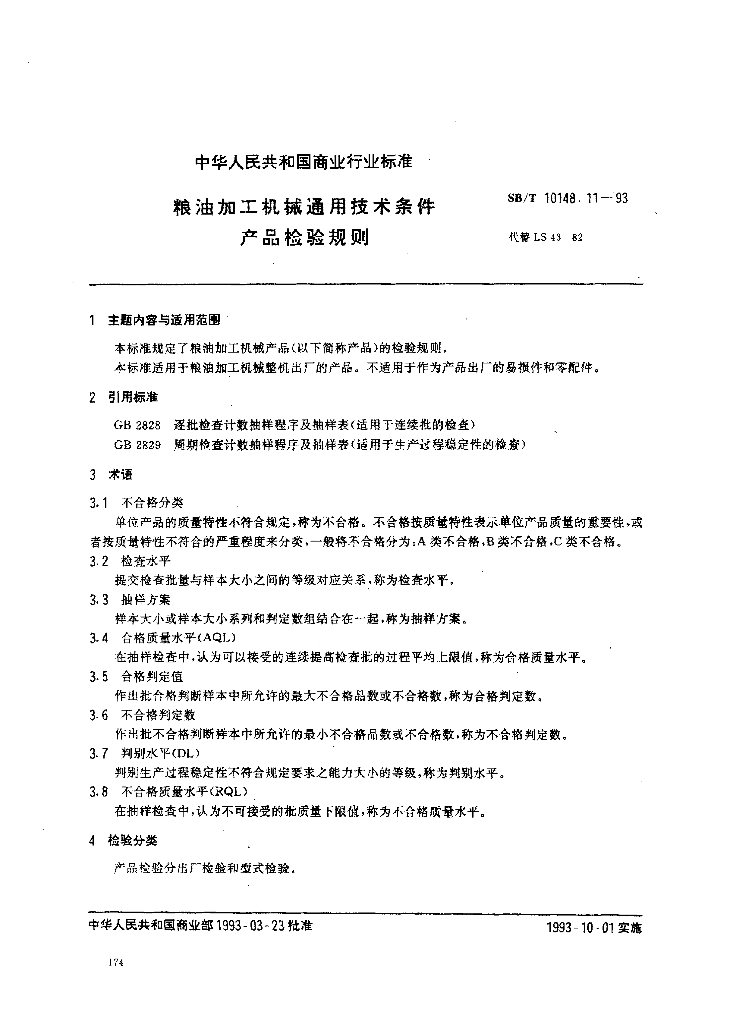 SB/T 10148.11-1993 粮油加工机械通用技术条件 产品检验规则(LS/T 3501.11-1993)