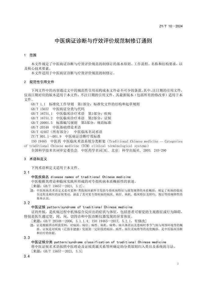 ZY/T 10-2024 中医病证诊断与疗效评价规范制修订通则