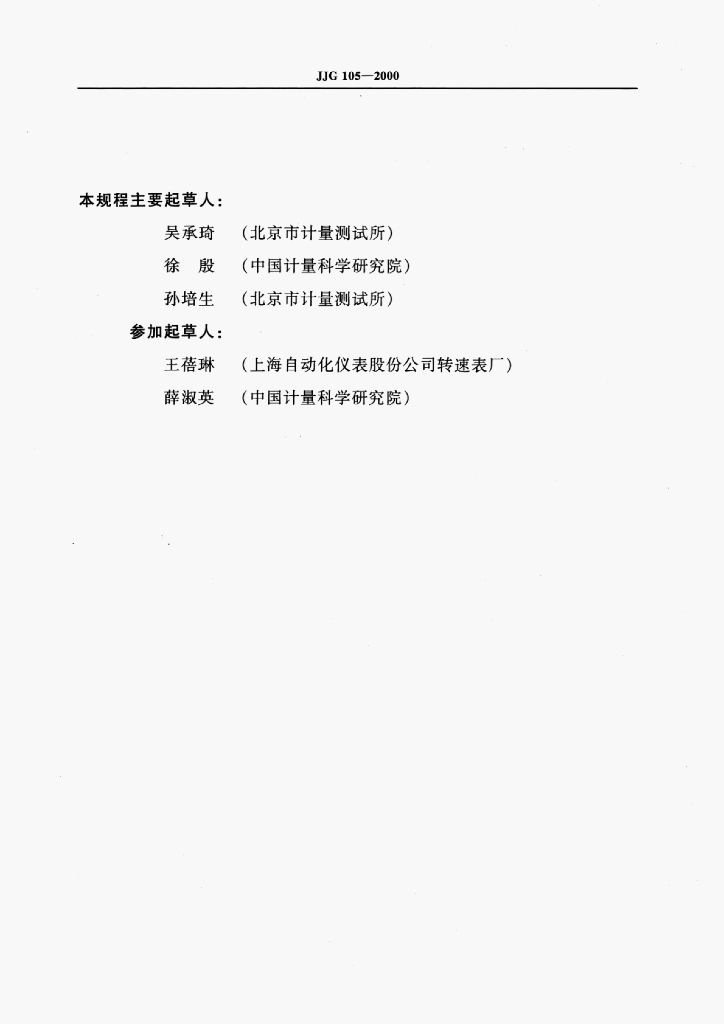 吴承琦(北京市计量测试所)、徐殷(中国计量科学研究院)、孙培生(北京市计量测试所)、王蓓琳(上海自动化仪表股份公司转速表厂)、薛淑英(中国计量科学研究院)
