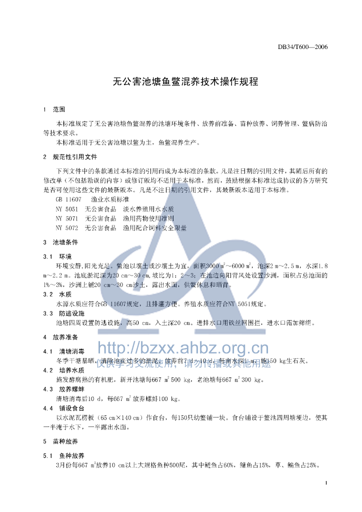 DB34/T 600-2006 无公害池塘鱼鳖混养技术操作规程