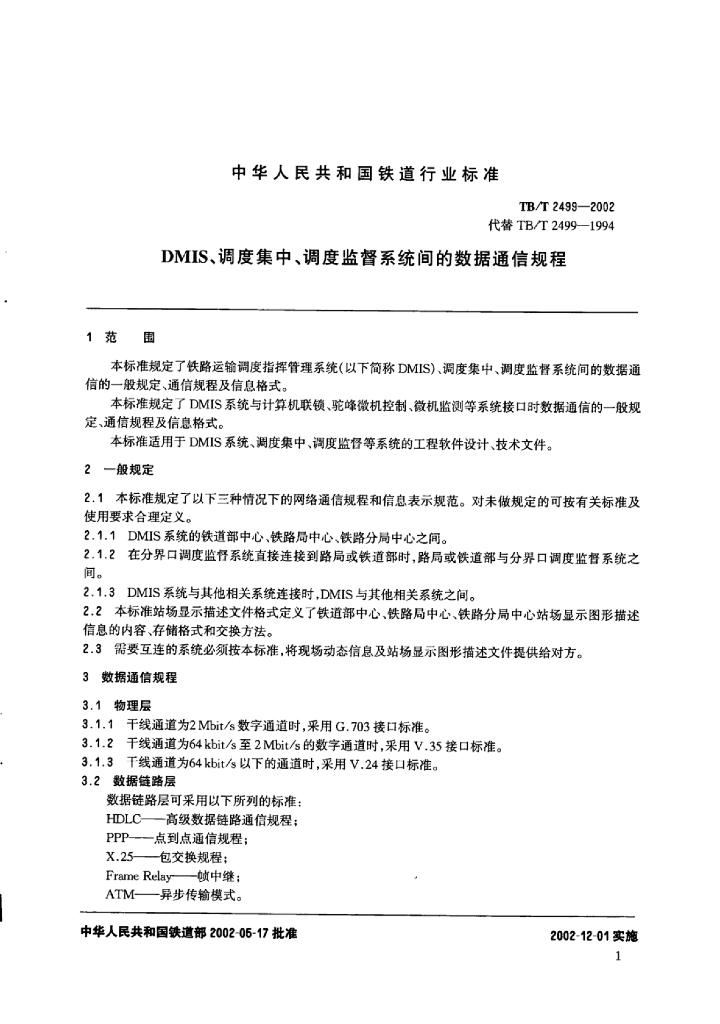 TB/T 2499-2002 DMIS、调度集中、调度监督系统间的数据通信规程