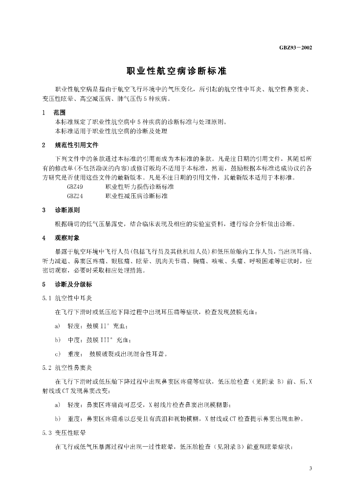 GBZ 93-2002 职业性航空病诊断标准