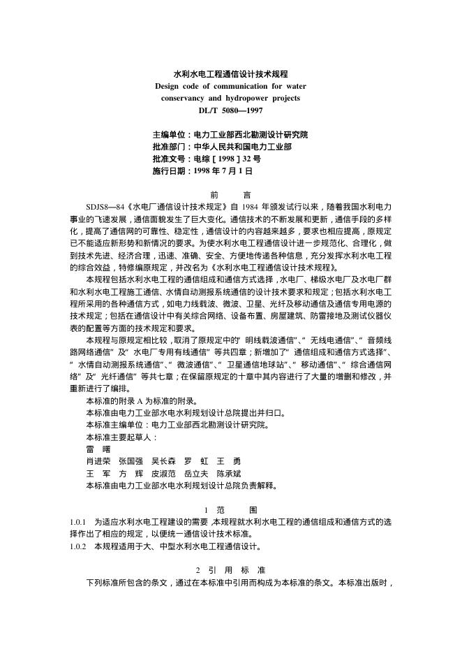 DL/T 5080-1997 水利水电工程通信设计技术规范