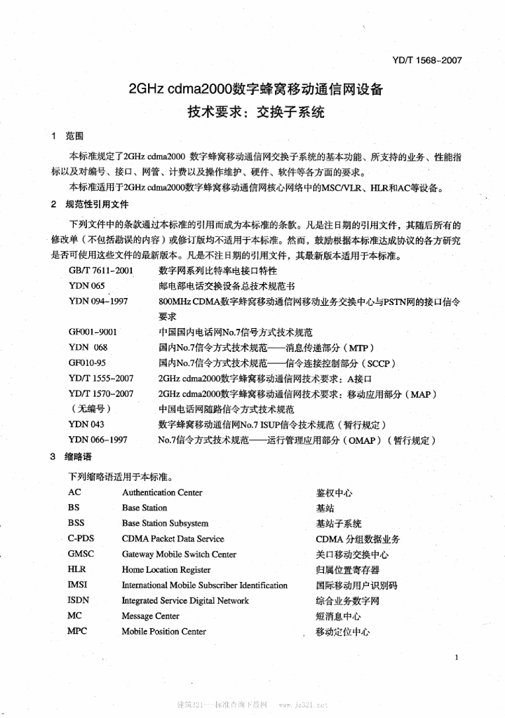 YD/T 1568-2007 2GHz cdma2000 数字蜂窝移动通信网设备技术要求:交换子系统