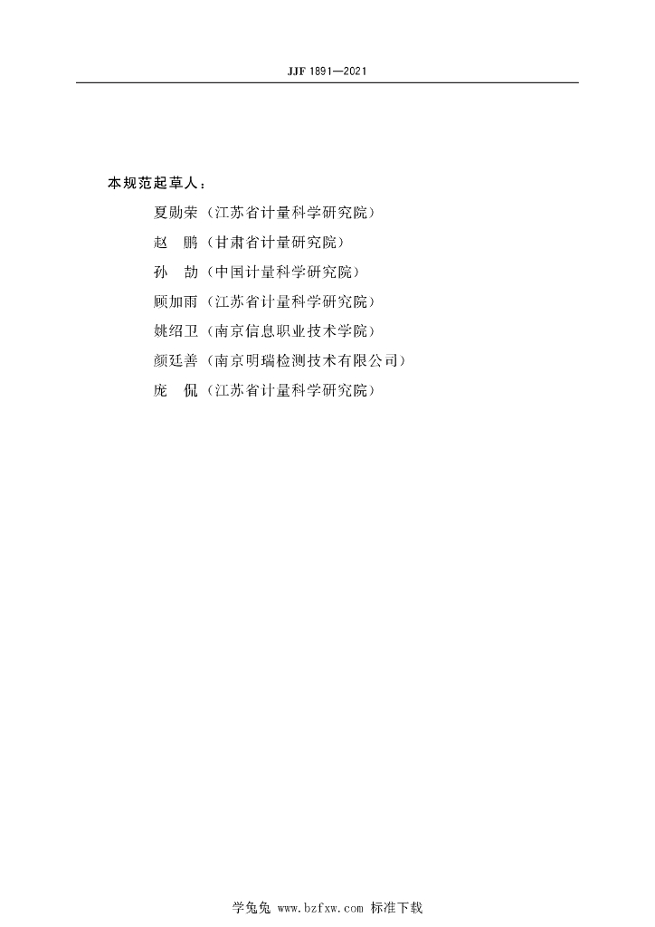 夏勋荣(江苏省计量科学研究院)、赵鹏(甘肃省计量研究院)、孙劼(中国计量科学研究院)、顾加雨(江苏省计量科学研究院)、姚绍卫(南京信息职业技术学院)、颜廷善(南京明瑞检测技术有限公司)、庞侃(江苏省计量科学研究院)