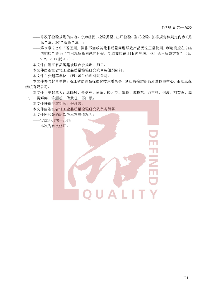 本标准由浙江省纺织测试研究院牵头组织制订。、本标准主要起草单位:浙江鑫兰纺织有限公司。、本标准参与起草单位:浙江省纺织品标准化技术委员会、浙江省棉纺织品质量检验中心、浙江金梭纺织有限公司、浙江三森纺织有限公司(排名不分先后)。