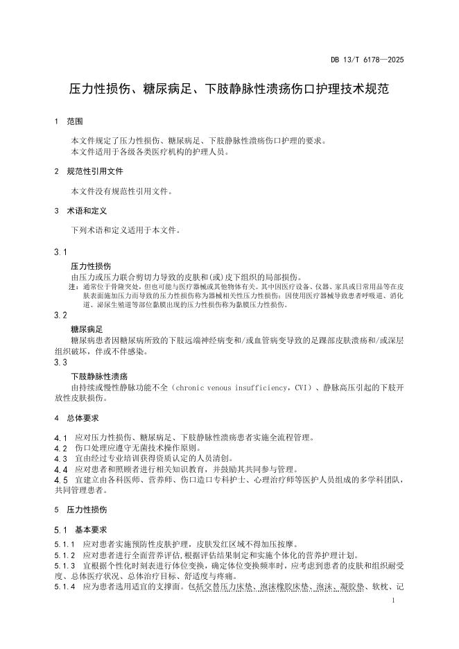 DB13/T 6178-2025 压力性损伤、糖尿病足、下肢静脉性溃疡伤口护理技术规范