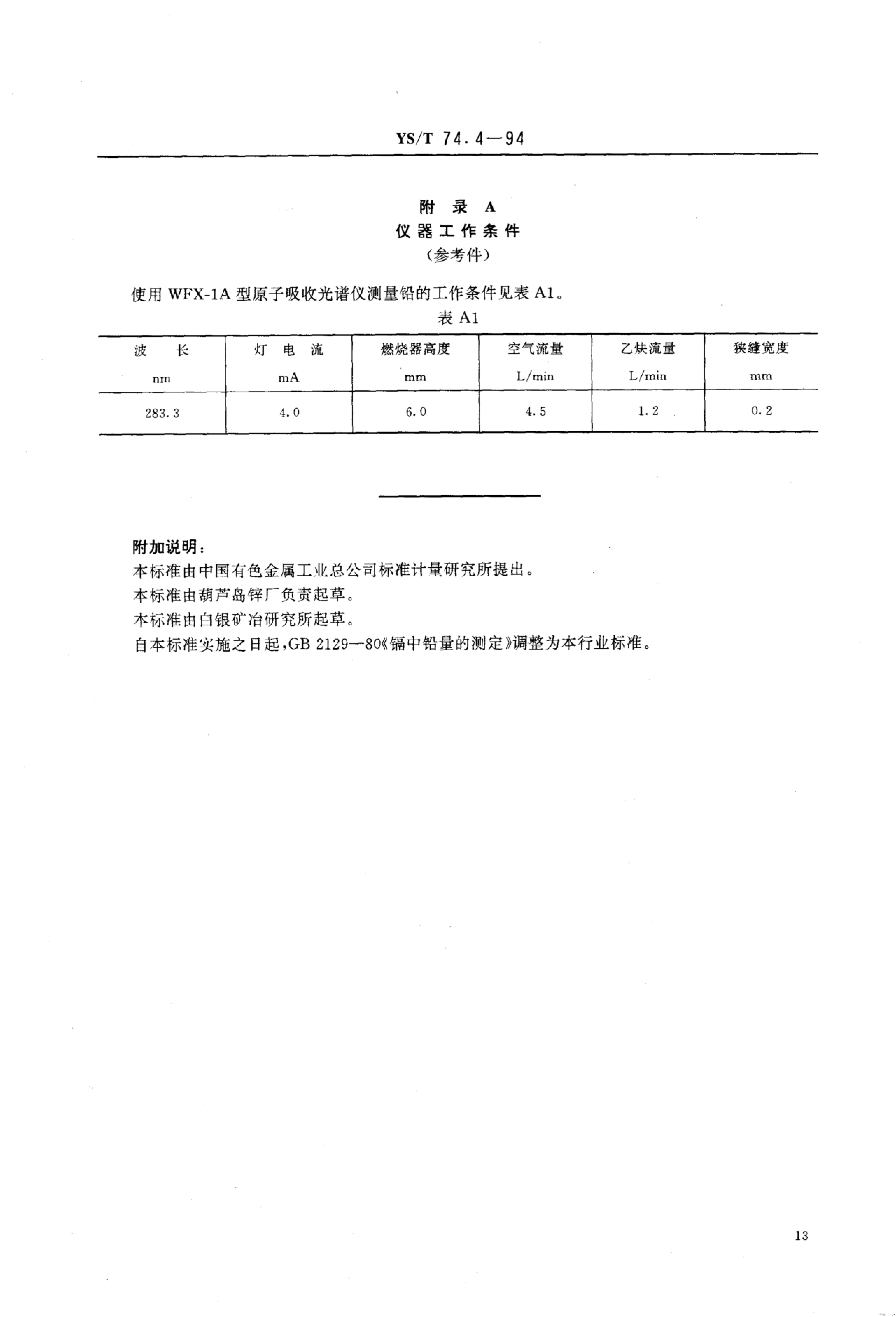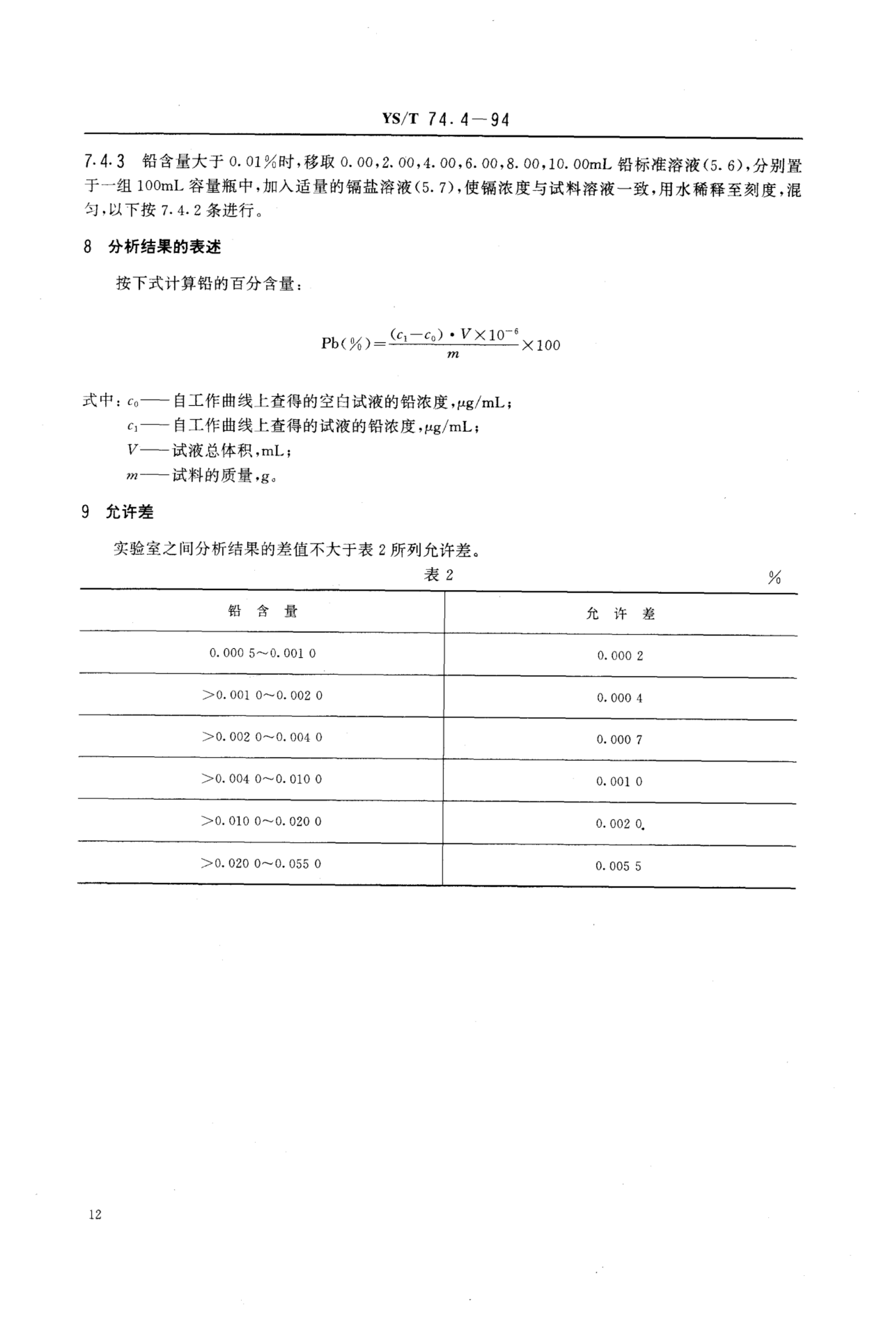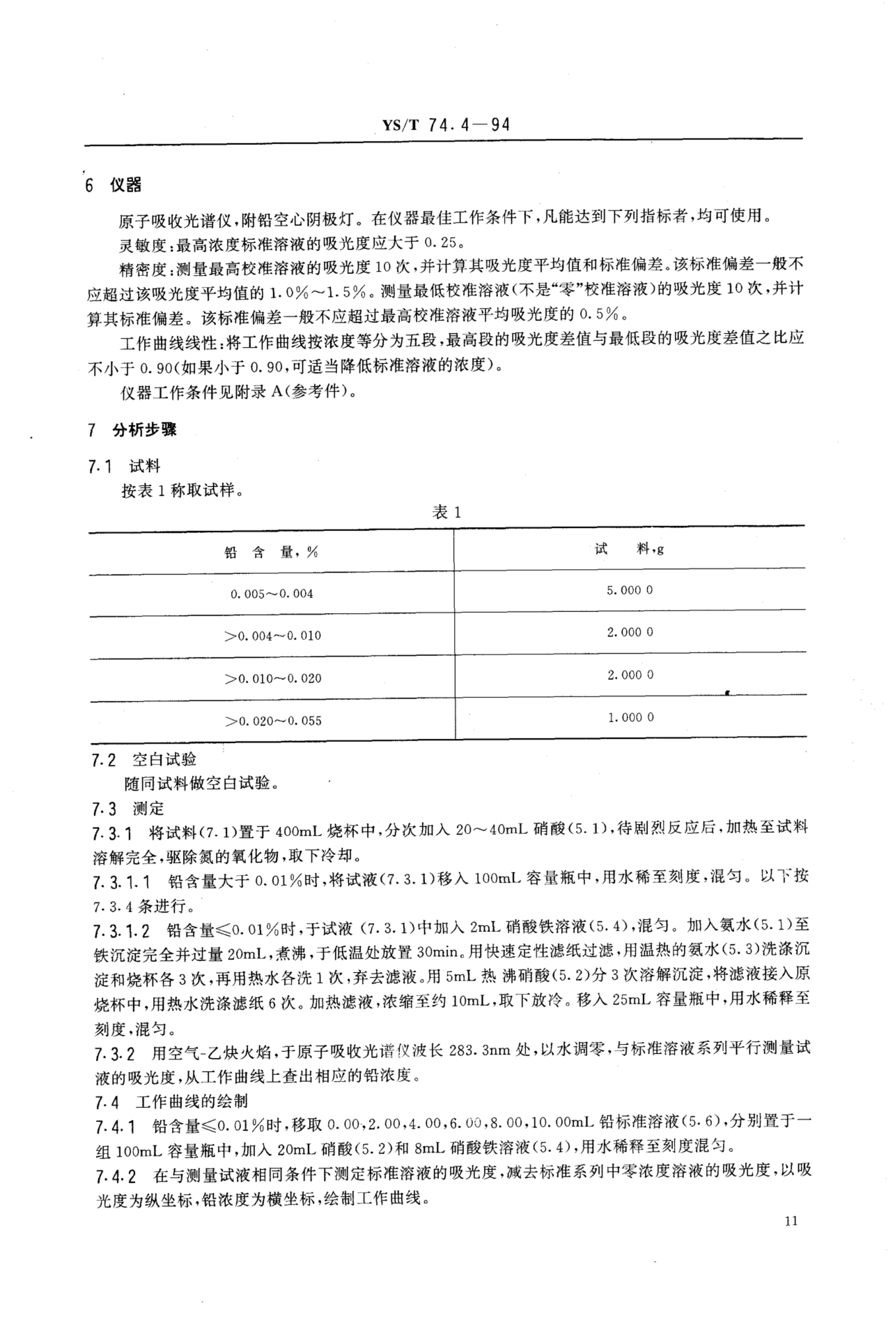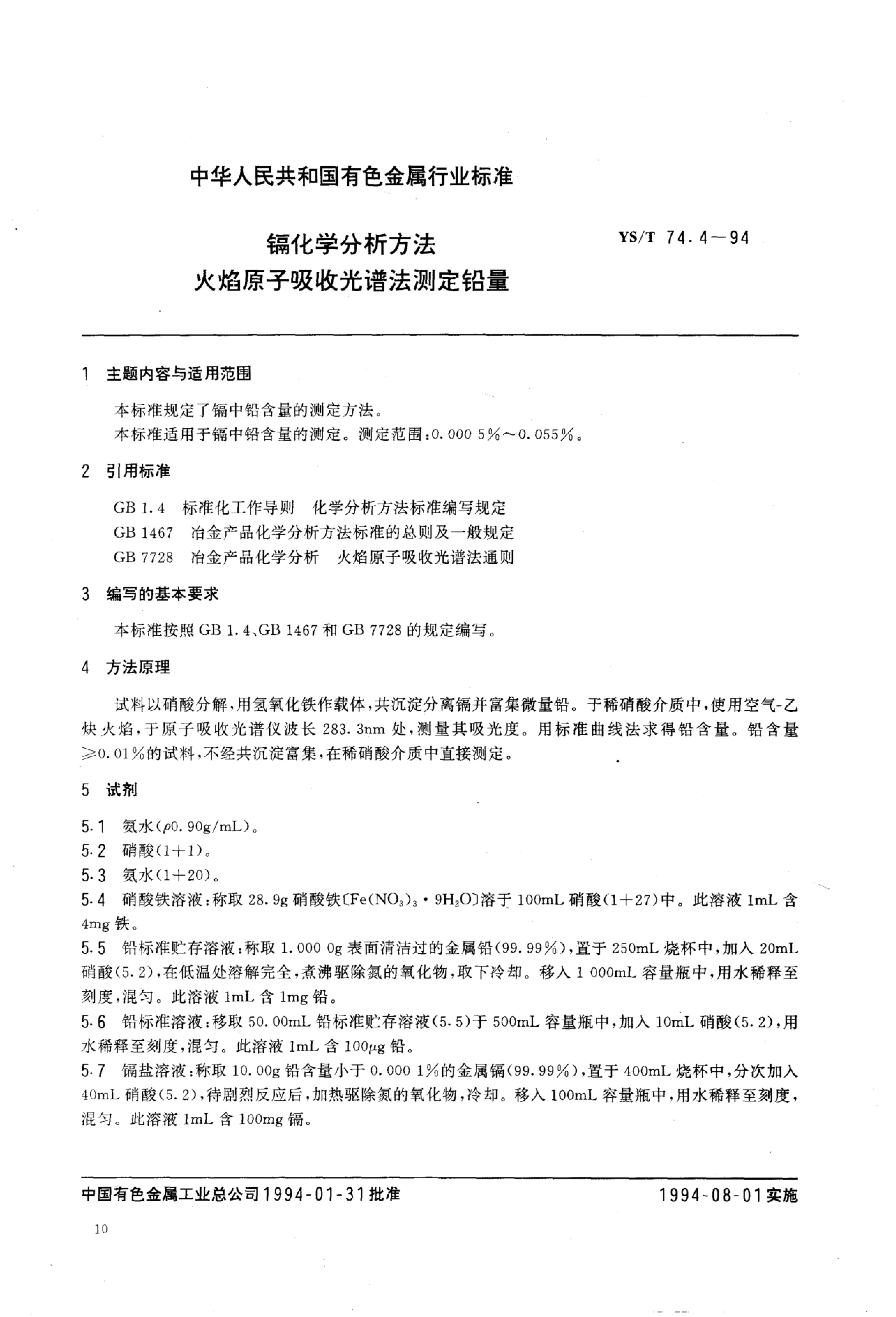 YS/T 74.4-1994 镉化学分析方法火焰原子吸收光谱法测定铅量