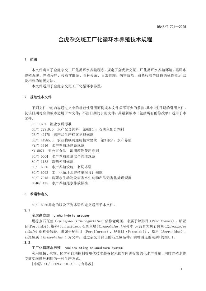 DB46/T 724-2025 金虎杂交斑工厂化循环水养殖技术规程