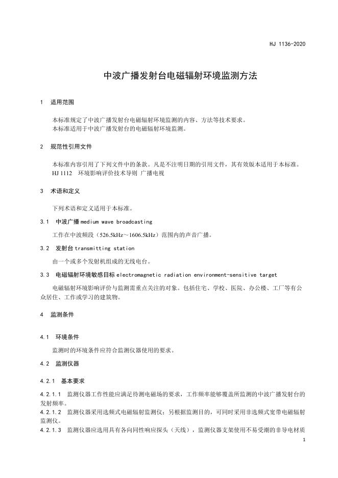 HJ 1136-2020 中波广播发射台电磁辐射环境监测方法