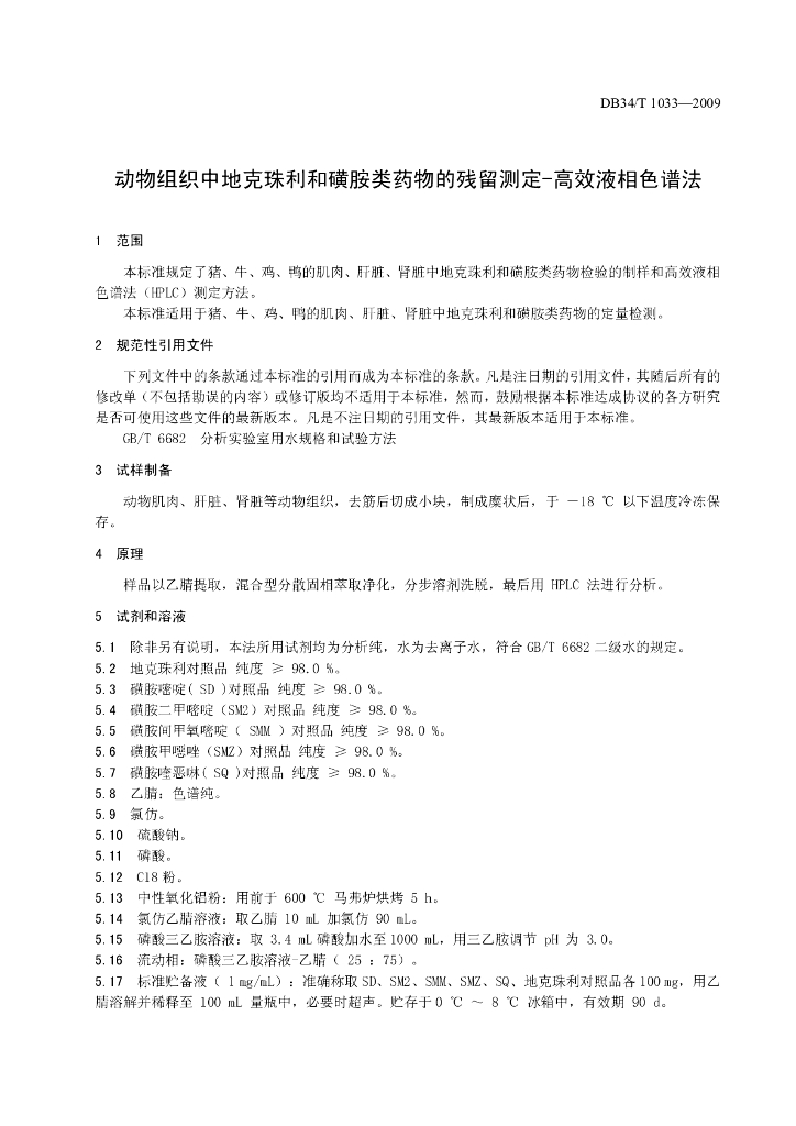 DB34/T 1033-2009 动物组织中地克珠利和磺胺类药物的残留测定-高效液相色谱法