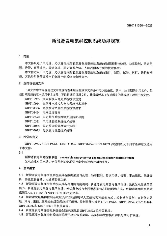 NB/T 11350-2023 新能源发电集群控制系统功能规范