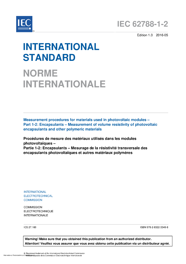 IEC 62788-1-2-2016 光伏模块用材料的测量程序 第1-2部分:灌封胶 光伏封装材料和其他高分子材料的体积电阻率测量