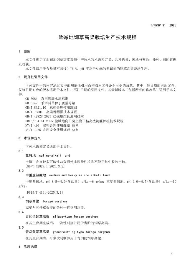T/NMSP 91-2025 盐碱地饲草高粱栽培生产技术规程