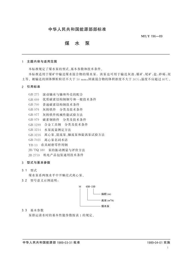MT/T 196-1989 煤水泵