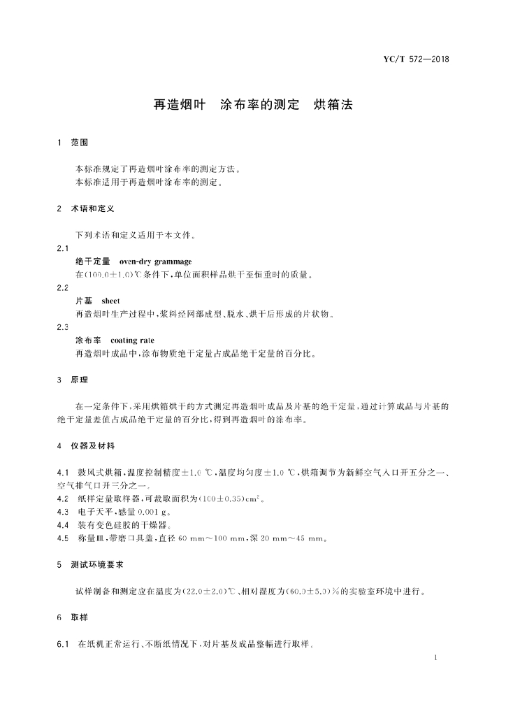 YC/T 572-2018 再造烟叶 涂布率的测定 烘箱法