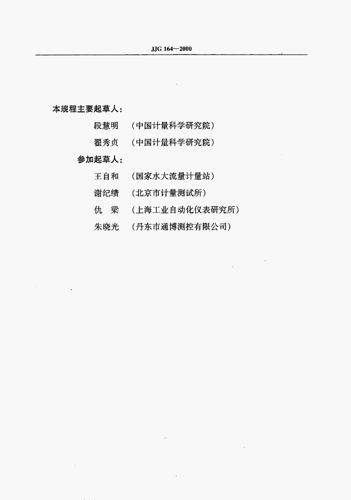 段慧明(中国计量科学研究院)、翟秀贞(中国计量科学研究院)、王自和(国家水大流量计量站)、谢纪绩(北京市计量测试所)、仇梁(上海工业自动化仪表研究所)、朱晓光(丹东市通博测控有限公司)