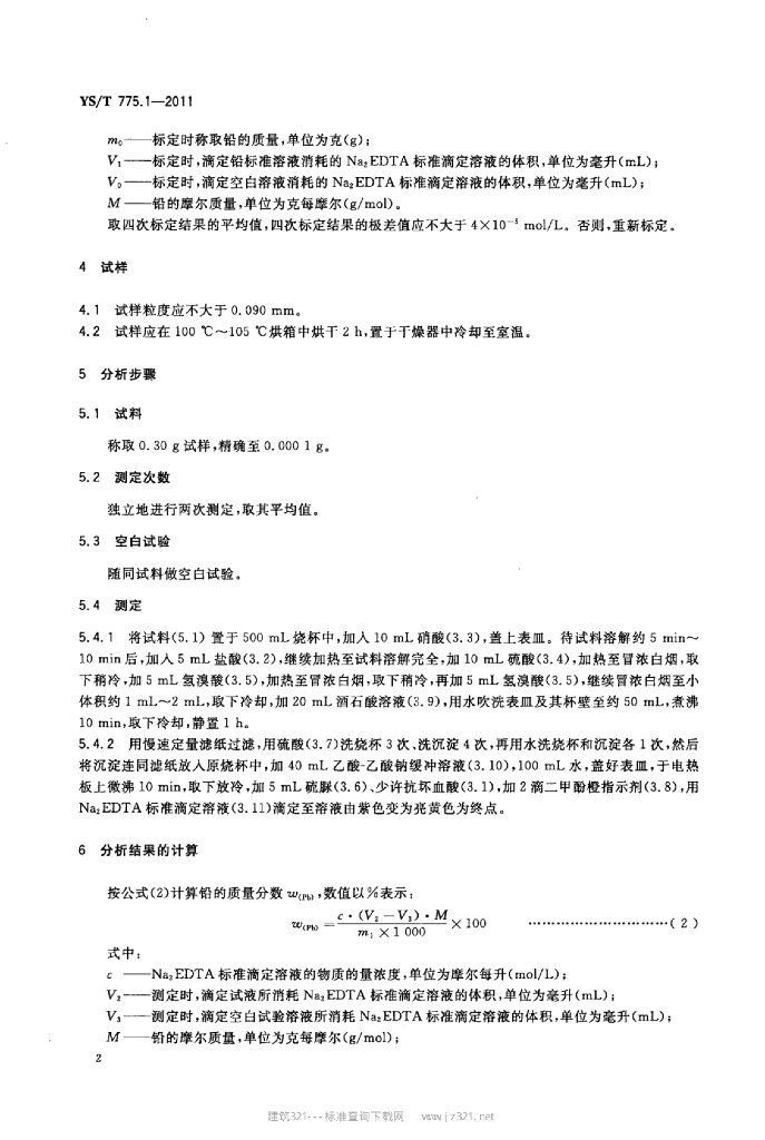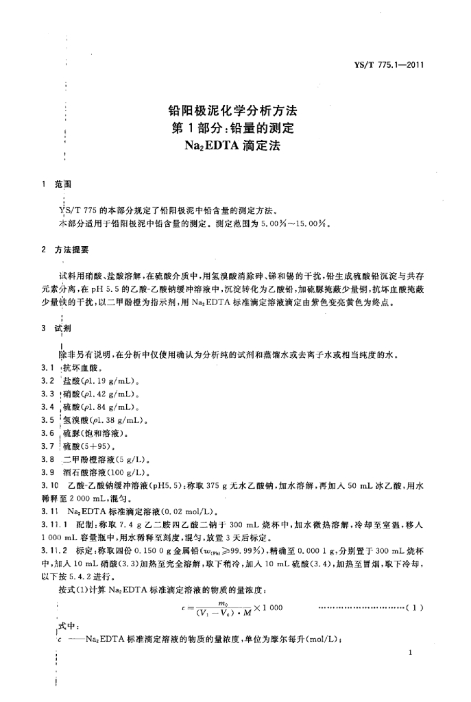 YS/T 775.1-2011 铅阳极泥化学分析方法 第1部分:铅量的测定Na2EDTA滴定法