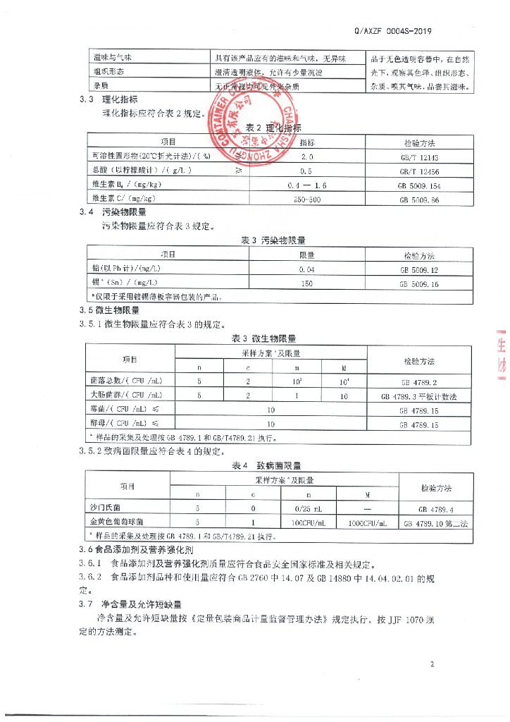Q/AXZF 0004S-2019 维生素饮料
