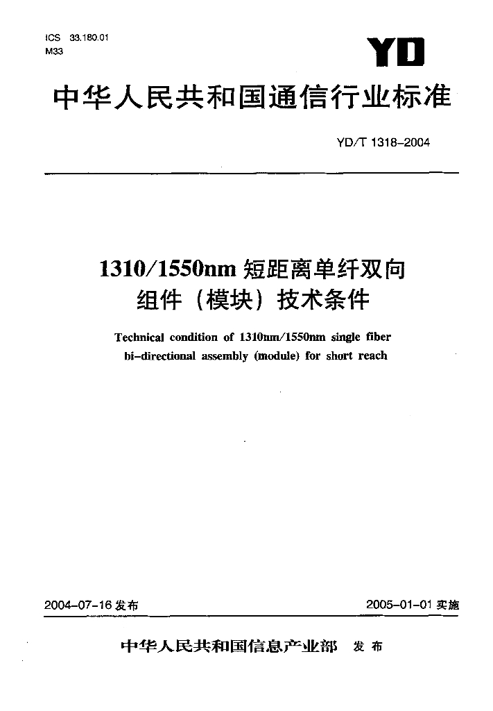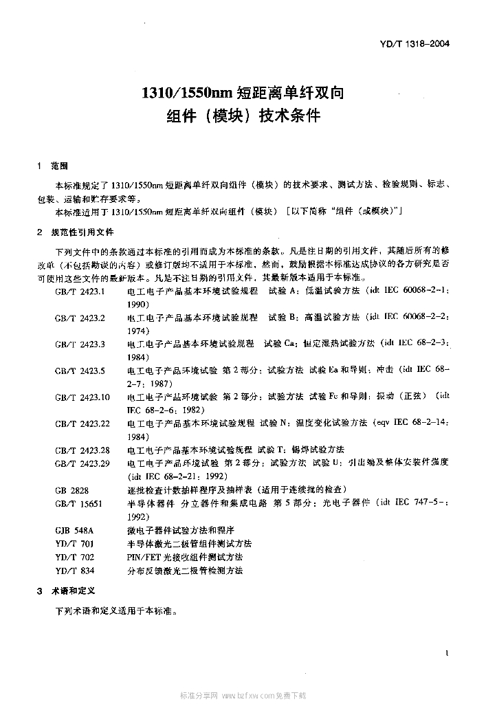 YD/T 1318-2004 1310/1550nm 短距离单纤双向组件(模块)技术条件
