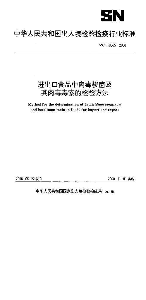 SN/T 0865-2000 进出口食品中肉毒梭菌及其肉毒毒素的检验方法