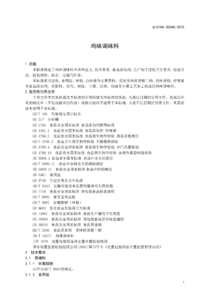 Q/01HH 0004S-2015 济南市长清区恒辉调味品厂 鸡味调味料
