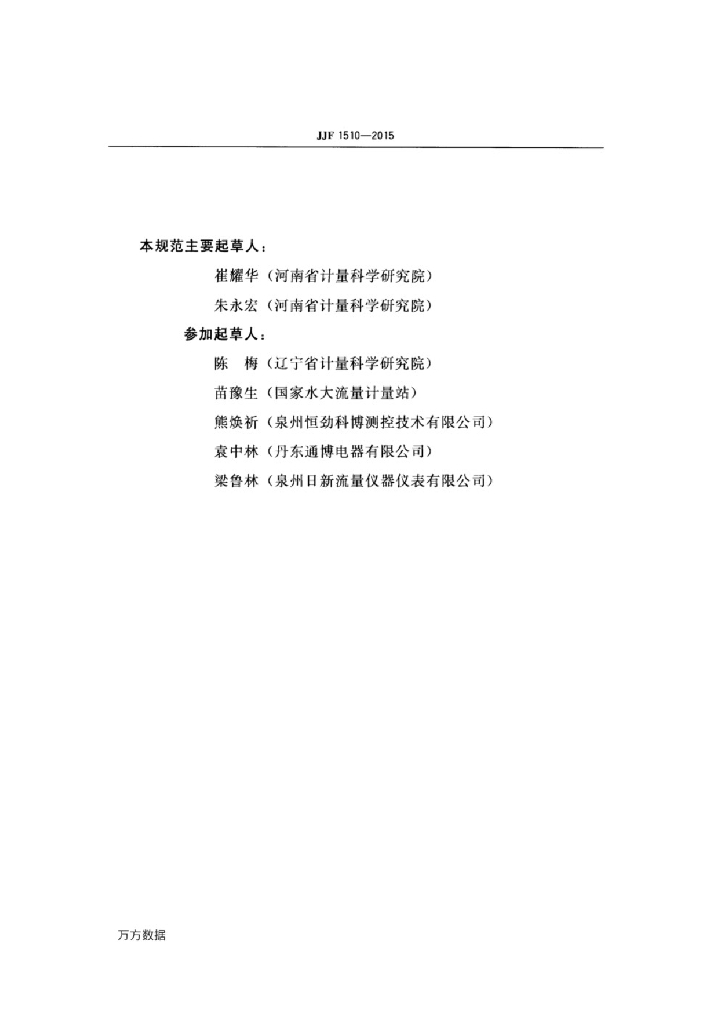 崔耀华(河南省计量科学研究院)、朱永宏(河南省计量科学研究院)、陈梅(辽宁省计量科学研究院)、苗豫生(国家水大流量计量站)、熊焕祈(泉州恒劲科博测控技术有限公司)、袁中林(丹东通博电器有限公司)、梁鲁林(泉州日新流量仪器仪表有限公司)
