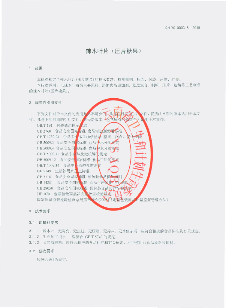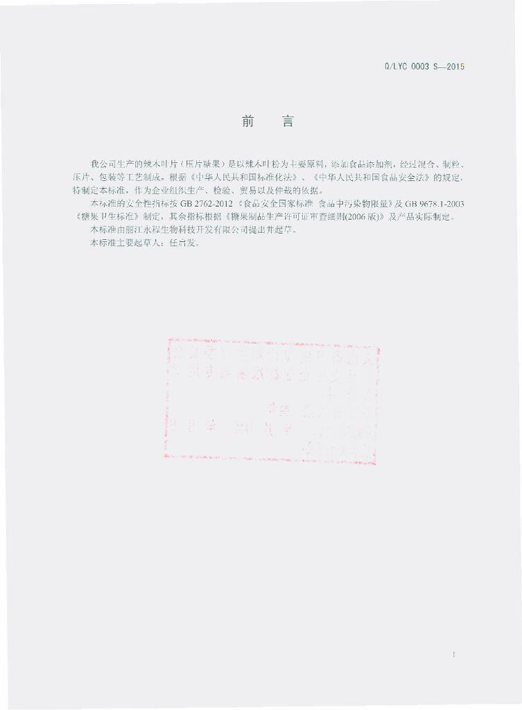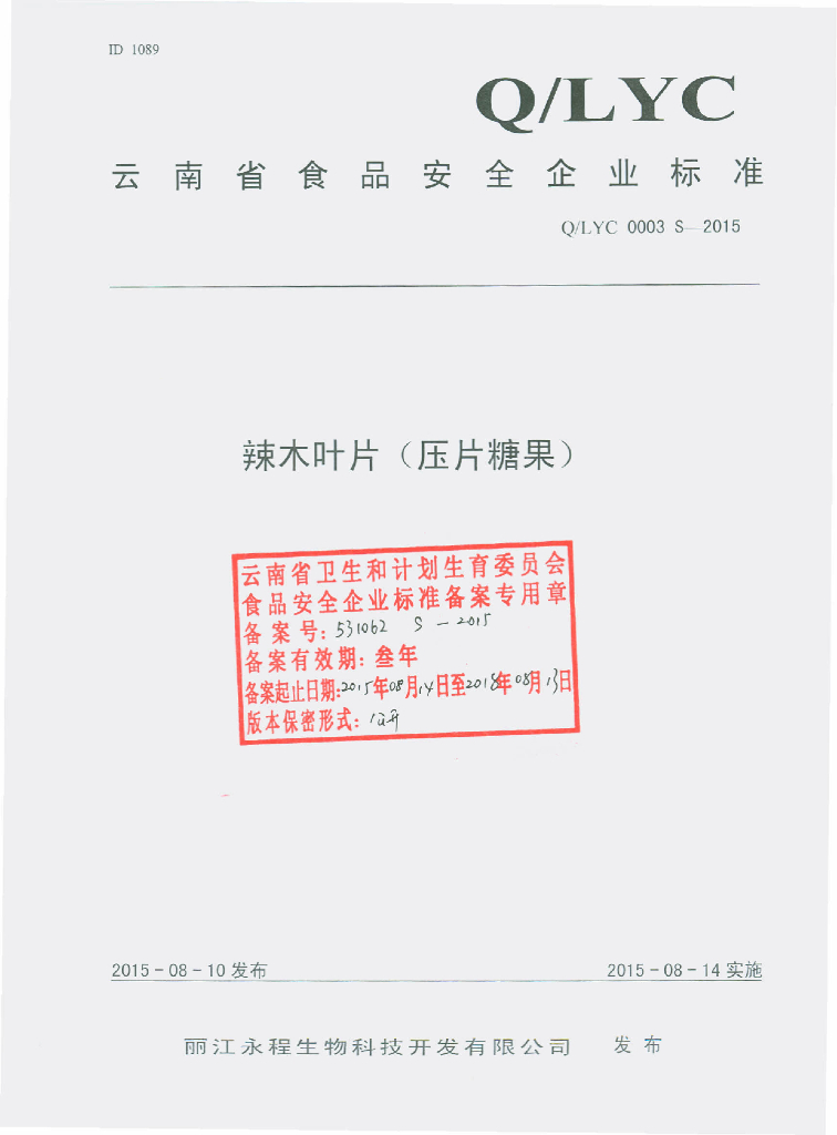 Q/LYC 0003S-2015 丽江永程生物科技开发有限公司 辣木叶片(压片糖果)
