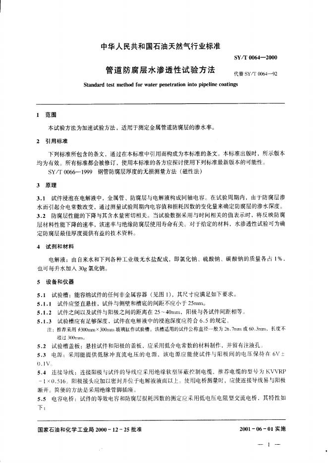 SY 0064-1992 管道防腐层水渗透性试验方法