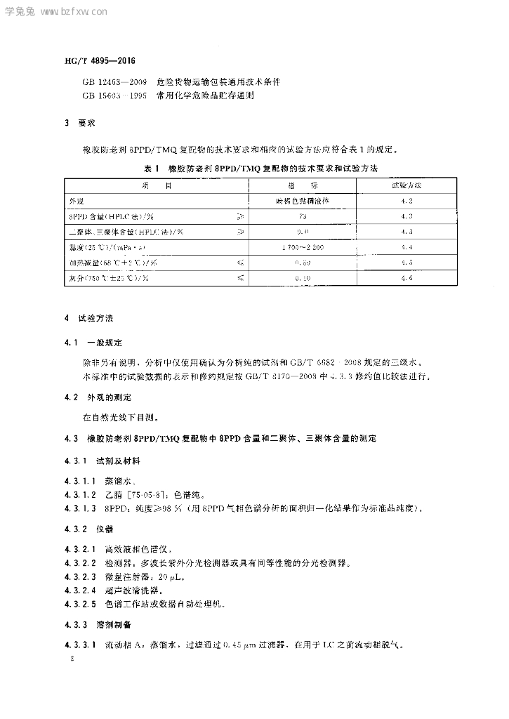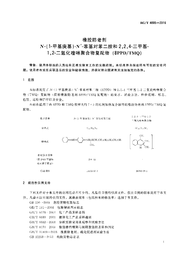 HG/T 4895-2016 橡胶防老剂 N-(1-甲基庚基)-N’-苯基对苯二胺和2,2,4-三甲基-1,2-二氢化喹啉聚合物复配物(8PPD/ TMQ)