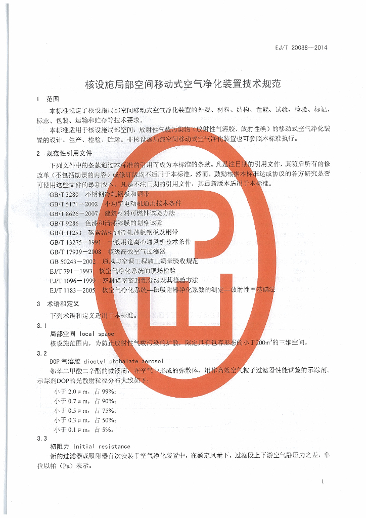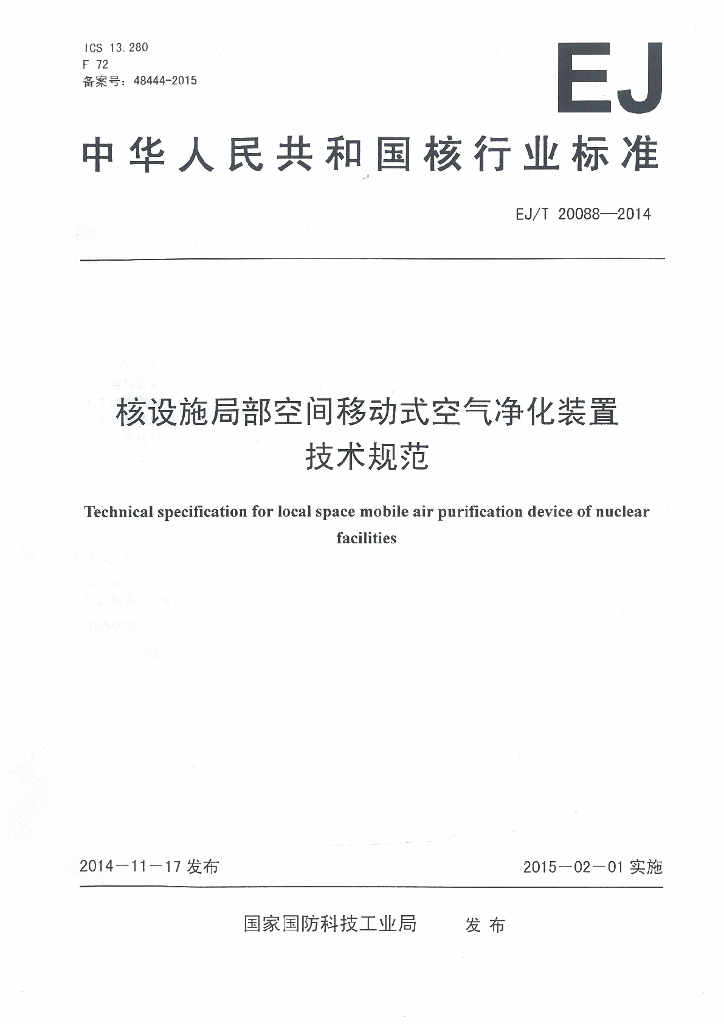 EJ/T 20088-2014 核设施局部空间移动式空气净化装置技术要求
