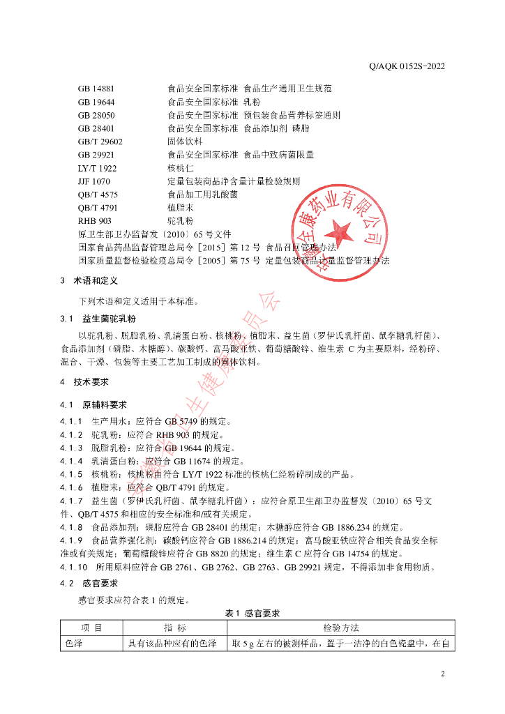 Q/AQK 0152S-2022 益生菌驼乳粉