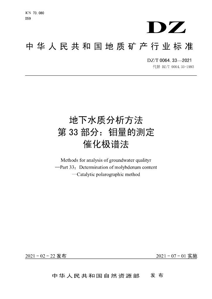 DZ/T 0064.33-2021 地下水质分析方法 第33部分:钼量的测定催化极谱法