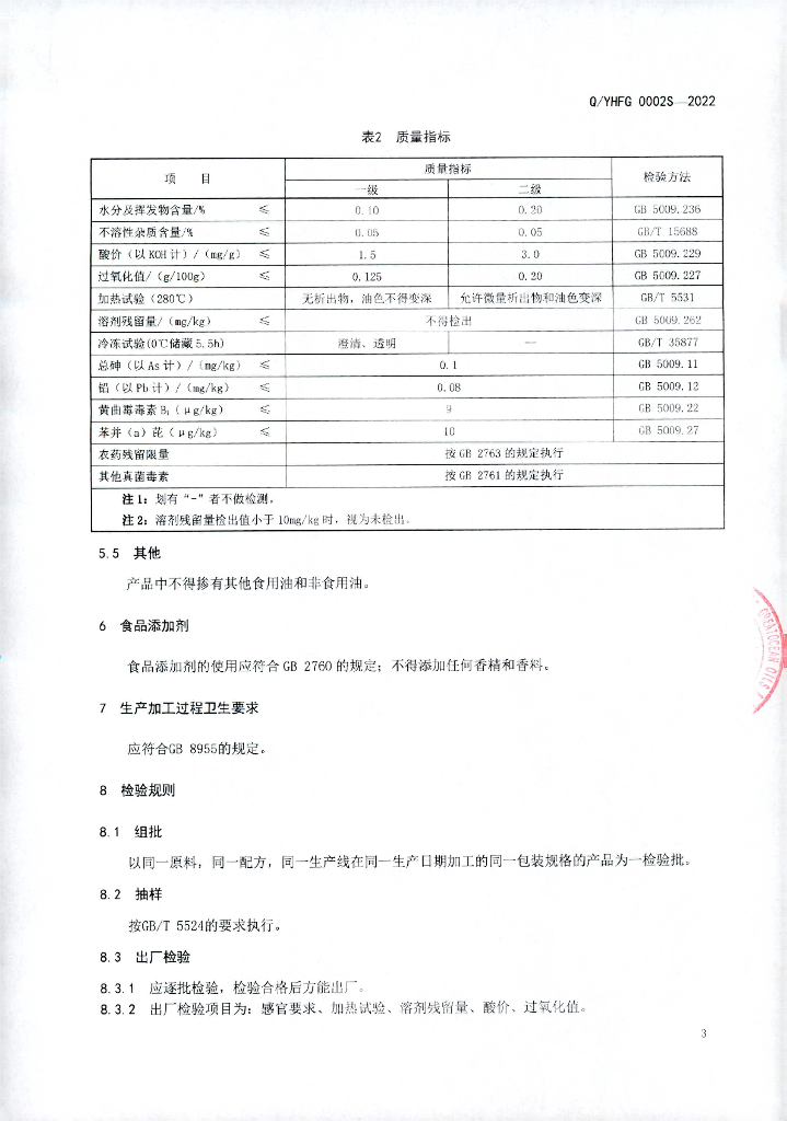Q/YHFG 0002S-2022 压榨菜籽油(食品加工用)