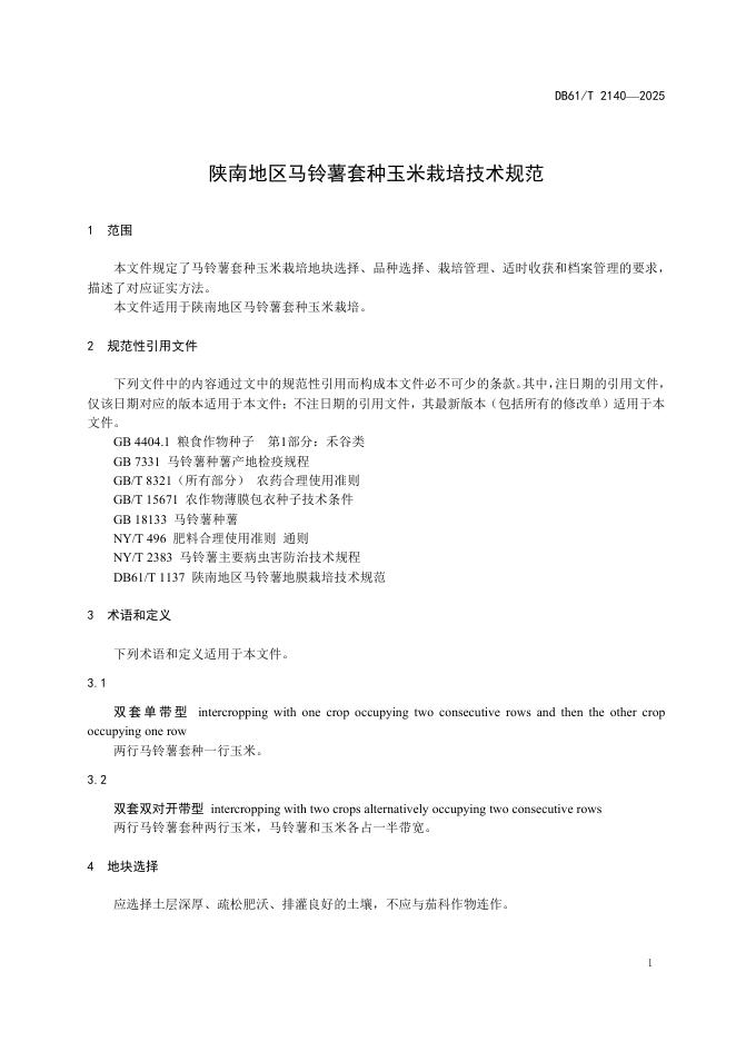 DB61/T 2140-2025 陕南地区马铃薯套种玉米栽培技术规范