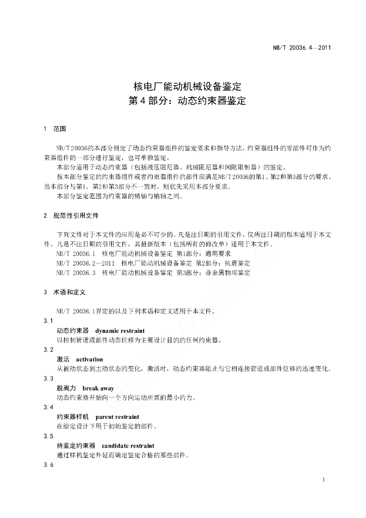 NB/T 20036.4-2011 核电厂能动机械设备鉴定 第4部分:动态约束器鉴定