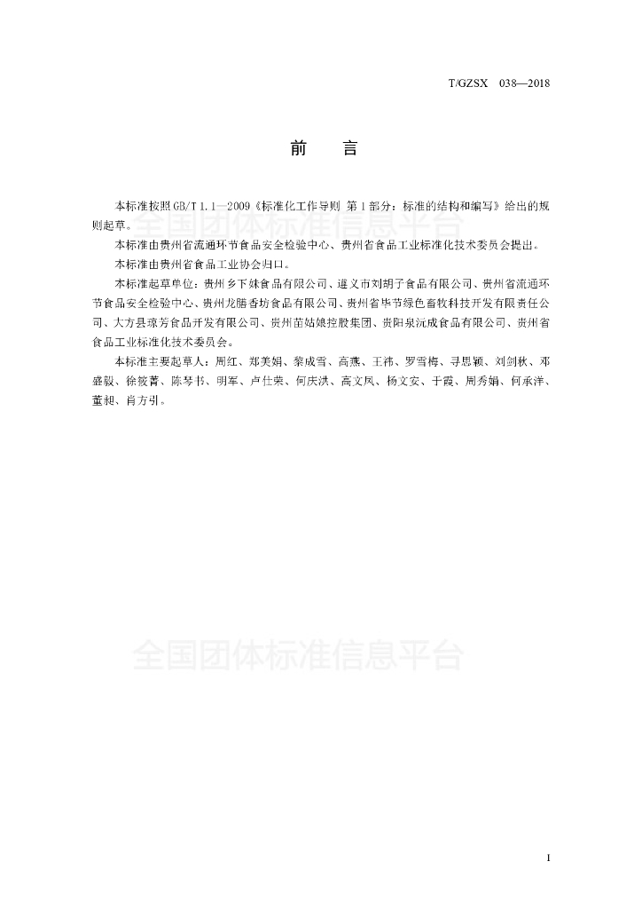 贵州乡下妹食品有限公司、遵义市刘胡子食品有限公司、贵州省流通环节食品安全检验中心、贵州龙膳香坊食品有限公司、贵州省毕节绿色畜牧科技开发有限责任公司、大方县琼芳食品开发有限公司、贵州苗姑娘控股集团、贵阳泉沅成食品有限公司、贵州省食品工业标准化技术委员会