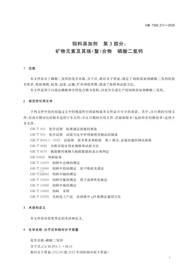 GB 7300.311-2025 饲料添加剂 第3部分:矿物元素及其络(螯)合物 磷酸二氢钙