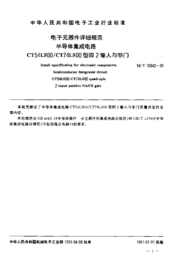 SJ/T 10042-1991 电子元器件详细规范 半导体集成电路CT54LS00/CT74LS00型,四2输入与非门