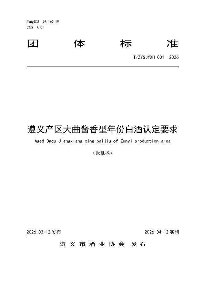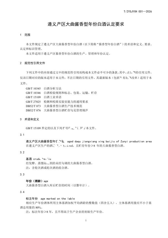 T/ZYSJYXH 001-2026 遵义产区大曲酱香型年份白酒认定要求