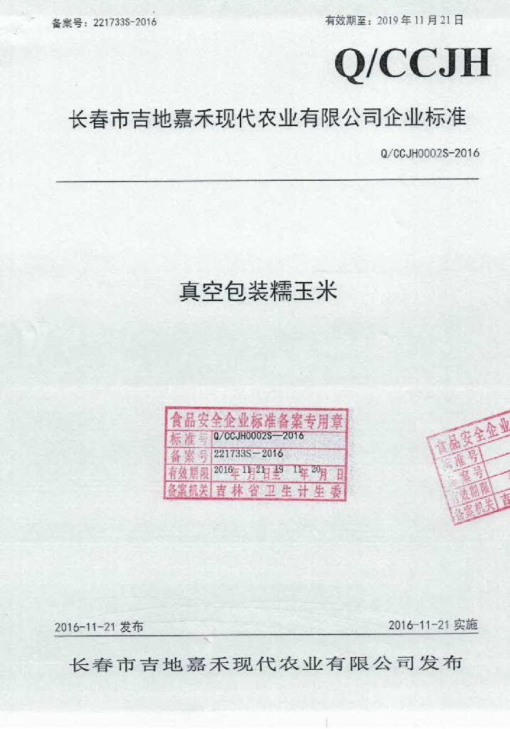 Q/CCJH 0002S-2016 长春市吉地嘉禾现代农业有限公司 真空包装糯玉米
